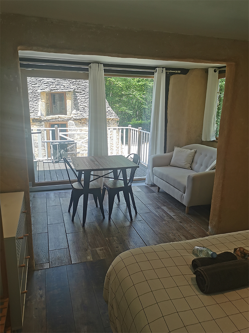 Rénovée en 2023, 23 m². Parking, terrasse privée avec table et 2 chaises, vue sur la Borie. Grand lit 160x200. Commode et penderie. Sdb double vasque, douche italienne, sèche-serviettes, sèche-cheveux. Petit salon, canapé, wifi, bouilloire électrique. Petit-déjeuner copieux servi entre 8 et 9h00.Deux années consécutives, en 2023 et 2024, prix d'excellence décerné par Booking avec une note globale de 9,5